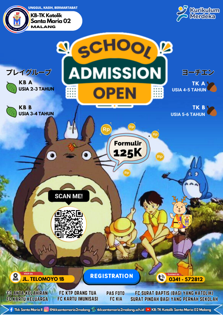Kesan saya: Saya bersyukur sekali krn orang tua saya mennyekolahkan saya di sekolah yang sangat tepat..krn yg mana tingkat taman kanak2 sangatlah penting untuk perkembangan otak anak dalam segi apapun..dan TKK Santa Maria 2 selalu mensupport seluruh murid2 dengan keunggulan2 yg telah dimiliki oleh sekolah ini..dr segi kedisiplinannya, ketrampilan dan bakat anak2 yg sll dikembangkan bahkan anak2 bs berprestasi dengan bakat2 yg dimiliki..TKK Santa Maria 2 merupakan sekolah yg sangat aktif untuk selalu melibatkan mrd2 agar terbiasa berani dan percaya diri untuk bs berprestasi sejak usia dini..bagi saya ini sangatlah penting untuk kehidupan anak2 kita di generasi yg akan datang..oleh krn itu sayapun tidak ragu2 utk menyekolahkan anak2 saya di TKK Santa Maria 2 yg selalu membuktikan prestasinya dr sejak saya kecil dulu..dan sekolah ini tdk pernah lelah utk selalu memberikan inovasi2 baru..dlm berbagai acara yg sdh diadakan sehingga sangat membantu anak utk bs terus berkarya dan berprestasi..sangat bangga bs menjadi alumni dan wali murid dari TKK Santa Maria 2 Malang😊Jayalah selalu TKK ku tercinta..Tuhan Memberkati🙏